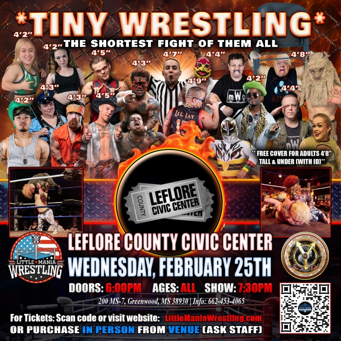 Come experience the shortest fight of them all on Wednesday February 25th 2026. Doors open at 6:00pm and the show starts at 7:30pm. All ages are welcome. Call 662-453-4065 to purchase your ticket. Learn more.